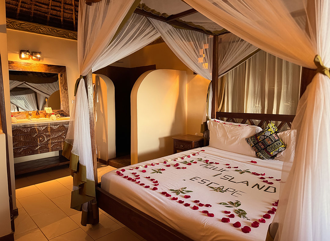 - Réservez un dîner romantique sur votre terrasse privée avec vue sur l'océan, décorée de fleurs locales, servi par majordome personnel pour profiter de moments inoubliables en toute tranquillité, avec comme seul bruit, le clapotis des vagues et le sifflement du vent qui vous entourent. Un délicieux repas préparé et servi avec soin, uniquement pour vous. Laissez le lodge vous organiser un duo de musique romantique avec guitare acoustique ou un spectacle masaï passionnant, pour égayer ce moment d'exception et créer des souvenirs encore plus mémorables de l'île.